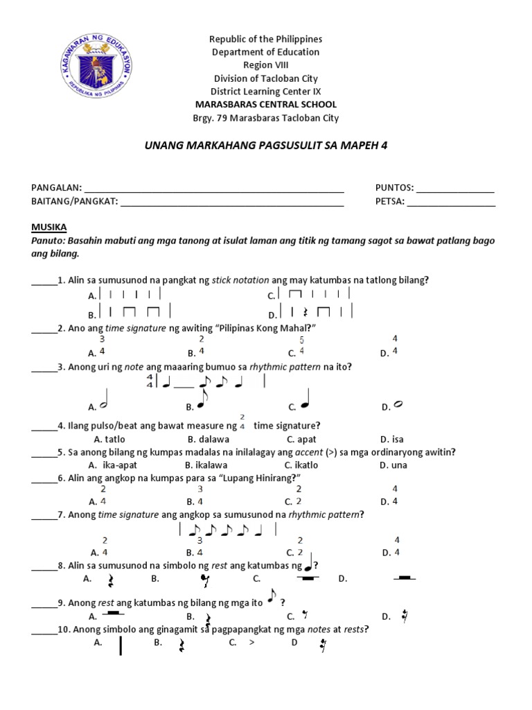 K To 12 Grade 4 Diagnostic Pre Test In Mapeh