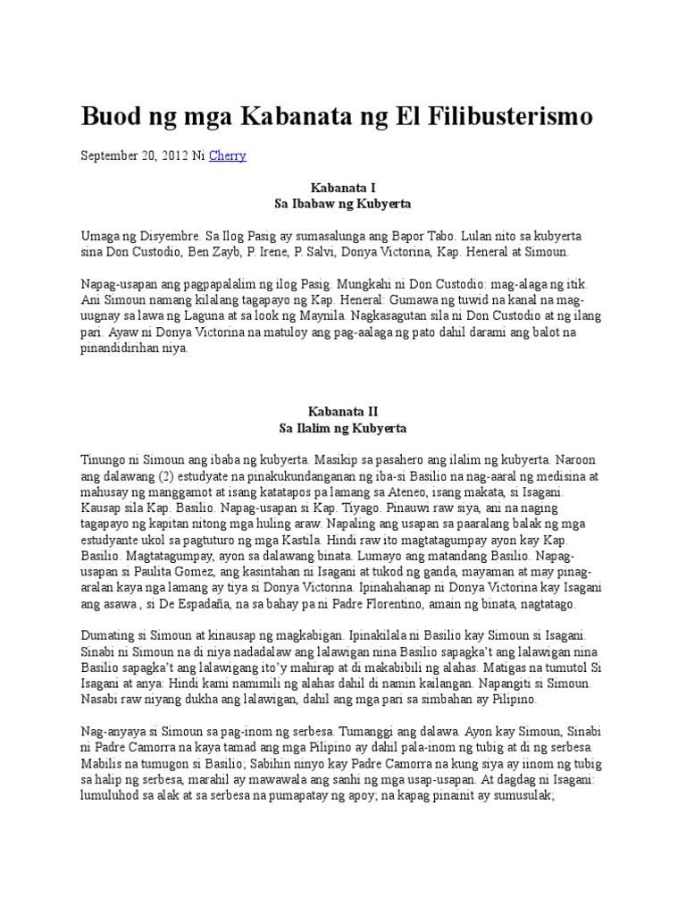 El Filibusterismo makabayang blogger. El Filibusterismo BuodPahiwatig ng Bawat Kabanata Historical Fiction. Makikita rin natin ang pagtyaga ni Kabesang Tales upang umuland ang buhay nya.